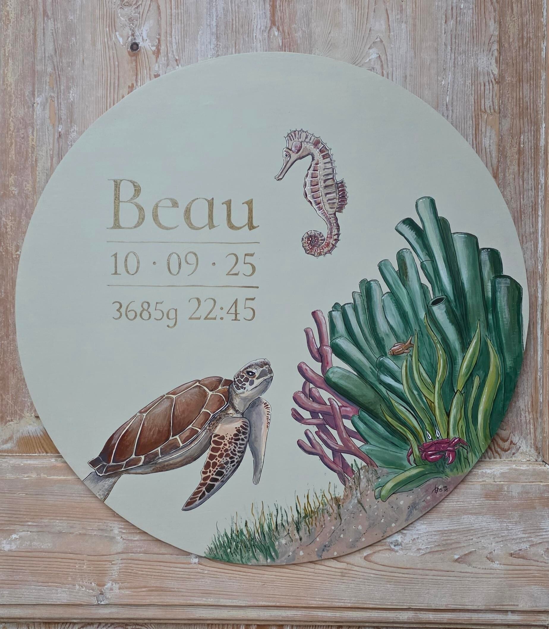 Nieuw leven – wat een bijzonder moment om iets moois voor te maken! Dit is een geboortebord van 50 cm doorsnede.