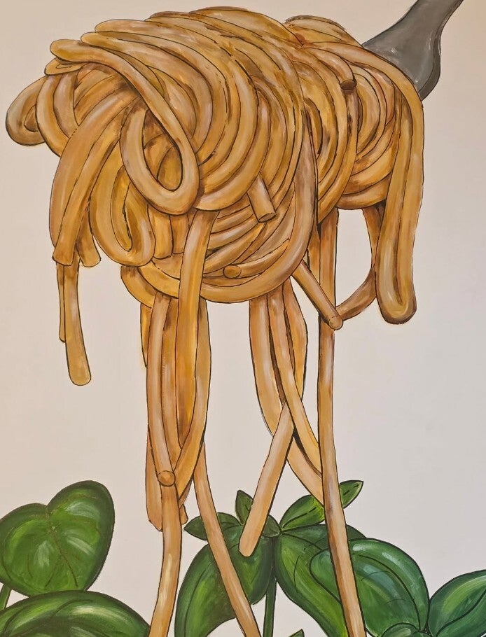 - Ik maakte een unieke muurschildering boven de keuken, geïnspireerd op de ingrediënten van een geliefd familierecept.